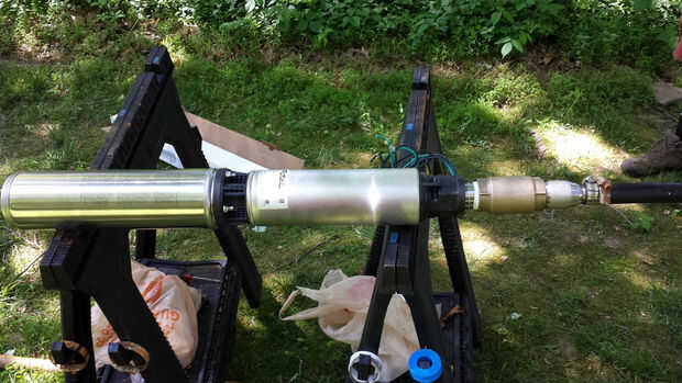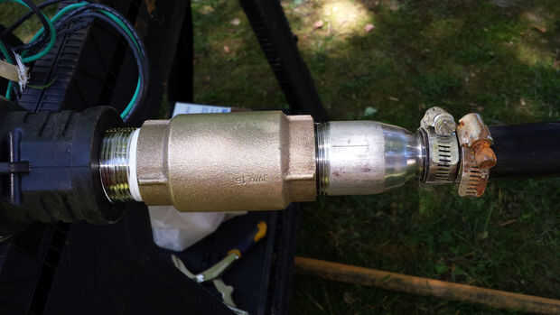 Mirando la foto de la Asamblea, hay un 1 1/4" acero inoxidable niple roscado en la parte superior de la bomba de pozo, una válvula de retención de 1 1/4" (latón) y un reductor de acero inoxidable (también conocido como "estímulo") que va en la línea de manguera. Usé mi salvado abrazaderas para fijar la nueva línea de agua para el reductor.