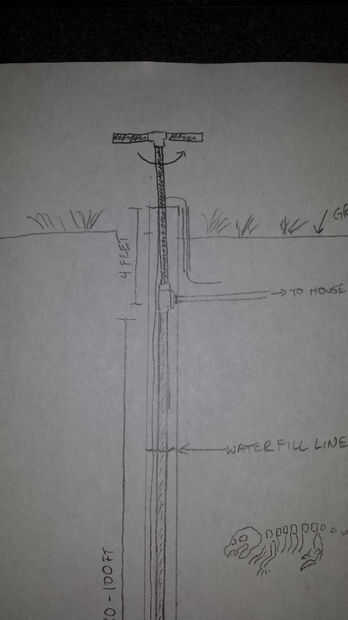 Conectores estándar de pozos utilizan un tubo de 1" roscada. Mina... por supuesto... era no estándar. Utiliza tubería de 3/4" roscadas. Para hacer una de estas llaves que se desciende a la ferretería local, comprar los tubos roscados y ponerlos juntos. El tubo largo (el uno que va hacia abajo en el agujero) debe ser al menos 5' de largo si usted quiere alcanzar.