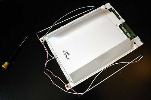 Paso 1: Cirugía de LCD Abra la carcasa, ten cuidado para la carga restante en condensadores: 94 V!Trabajar su camino a través de desarmar la cosa, sacar la unidad de visualización. La unidad está enmarcada en metal fino, generalmente ligada con cinta