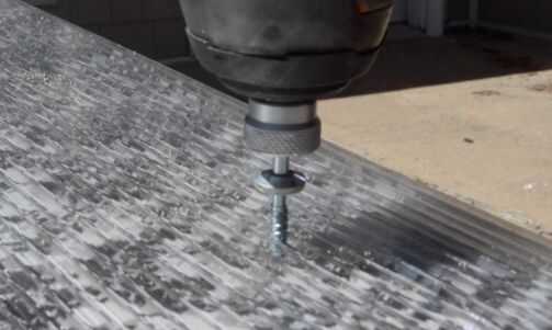 No apriete sus tornillos. Apriete lo suficiente para aplastar la arandela de goma hacia abajo un poco. Los tornillos Irán a través del policarbonato y el vinilo y en la madera contrachapada. Asegúrese de que sus tornillos son la longitud adecuada (dependiendo de la profundidad de la madera contrachapada que utilice) no desea que los tornillos demasiado largos y sobresalen de la parte inferior.