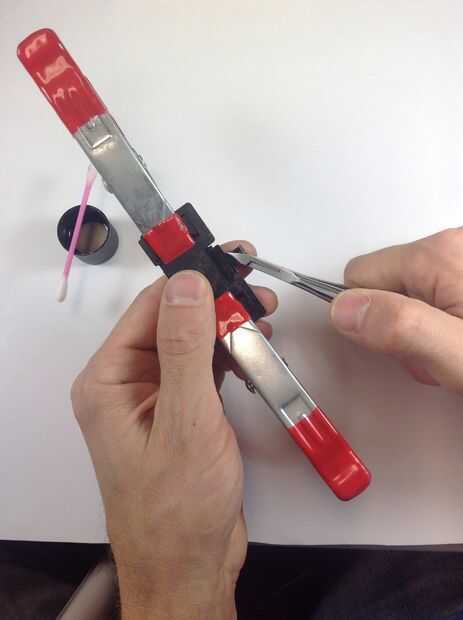 La ficha pequeña de la parte superior de la botella usando cortauñas de clip, generalmente puede crear una línea de puntuación y luego doblarlo hasta que se despeguen. Sosteniendo las piezas recién encoladas.