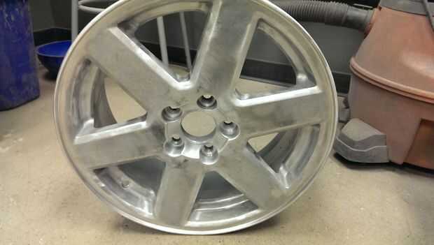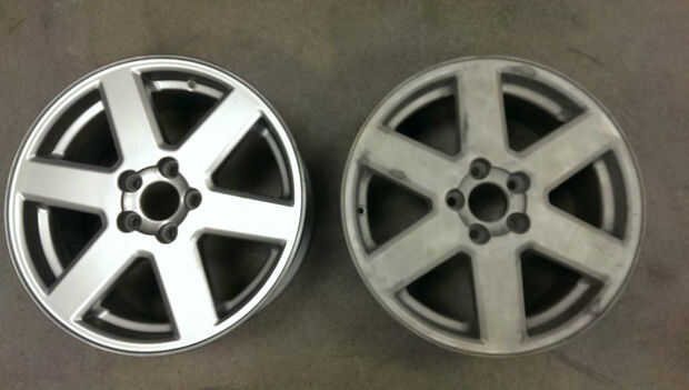 La primera foto muestra la rueda en su estado original y la versión de chorreo de arena del post junto a él. La imagen hace que el estado original se vea mucho mejor que en persona, se puede ver la versión después rueda ha perdido su brillo pero el final es intacto.