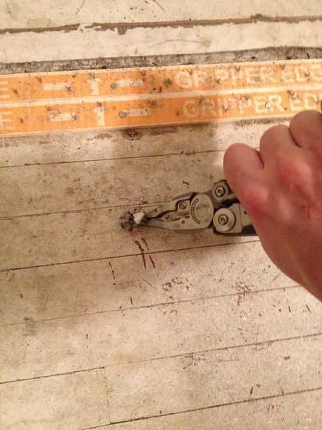 Una vez que se quita la alfombra y acolchado, habrá grapas y tiras de la espiga tienes que quitar. Las grapas deben salir fácilmente con unas pinzas, y spike franja aparecerá con una palanca o lo nailremover de un martillo.