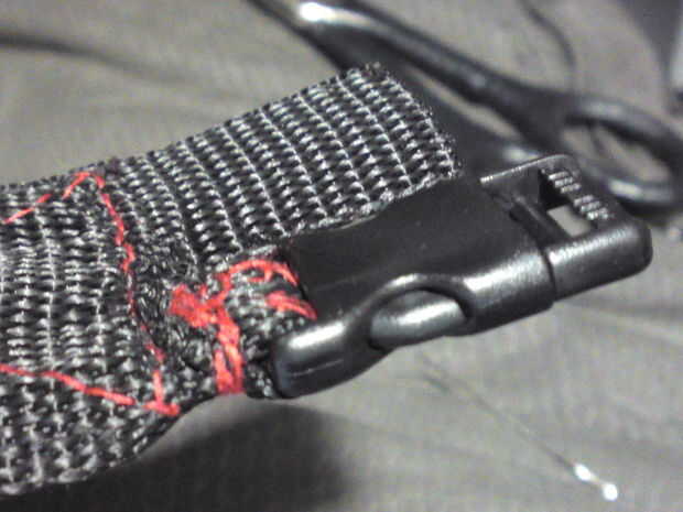 Básicamente lo quiero hacer es roscar la pieza de una pulgada de la parte delantera y la parte superior de la correa (el extremo de la correa con el pedazo de "Gancho" del velcro cosido en) a través de la parte inferior de las hebillas del lanzamiento lateral (la parte hembra de la hebilla del lanzamiento lateral) veces más de la mitad de la final de una pulgada de la correa que pasa por el lado de liberación hebilla de pliegues entonces sobre sí mismo así que usted puede coser permanentemente el lanzamiento lateral la hebilla en la correa.