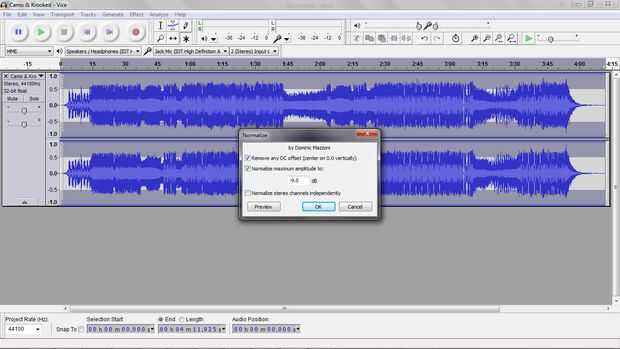 En la barra de herramientas superior haga clic en efectos luego en el menú desplegable y busca normalizar. Se abrirá una pequeña ventana que le da la opción de cómo mucho a normalizar. Yo seleccione ya sea entre-9.0 y-15.0 o elegir por sí mismo y escuchar hasta el nivel deseado y haga clic en Aceptar. El nivel de la canción entonces se verá más bajo que lo que hizo primero.