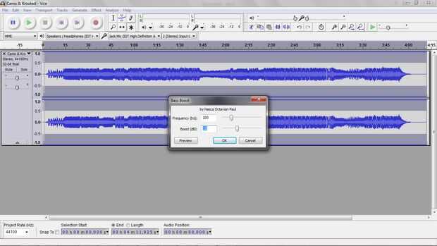 Una vez que han normalizado la canción, en los efectos menú desplegable haga clic en BassBoost. Luego se abrirá otra pequeña ventana dando la opción de cambiar la frecuencia y el impulso. Cambiar el impulso que en cualquier lugar entre 10 y 15 o hasta el nivel deseado. Te recomiendo previsualizar la canción antes de que usted haga clic en Aceptar.