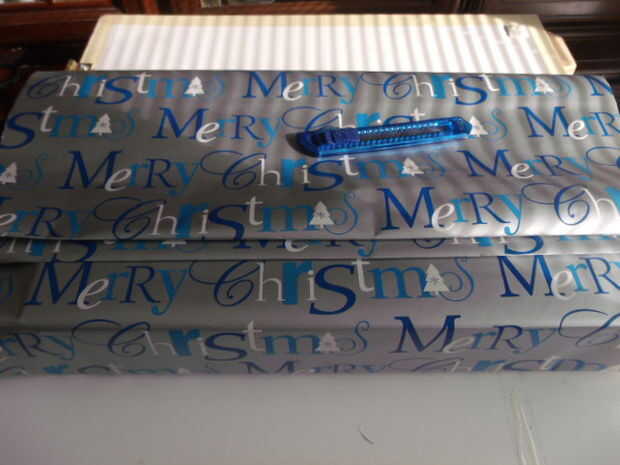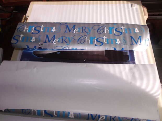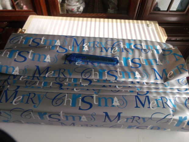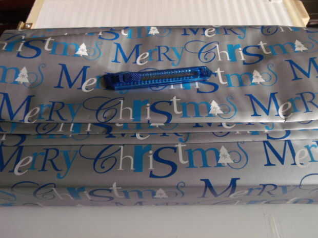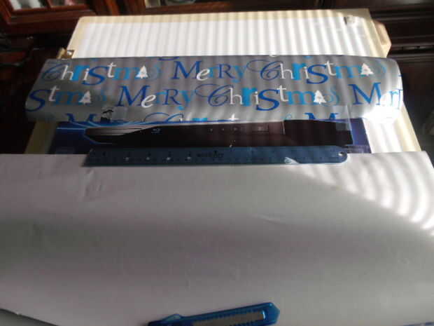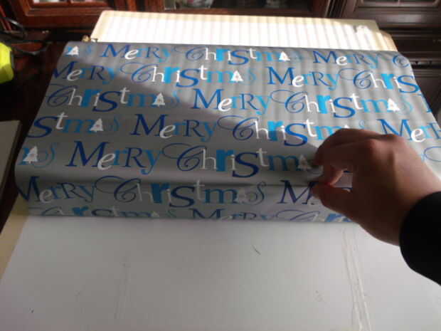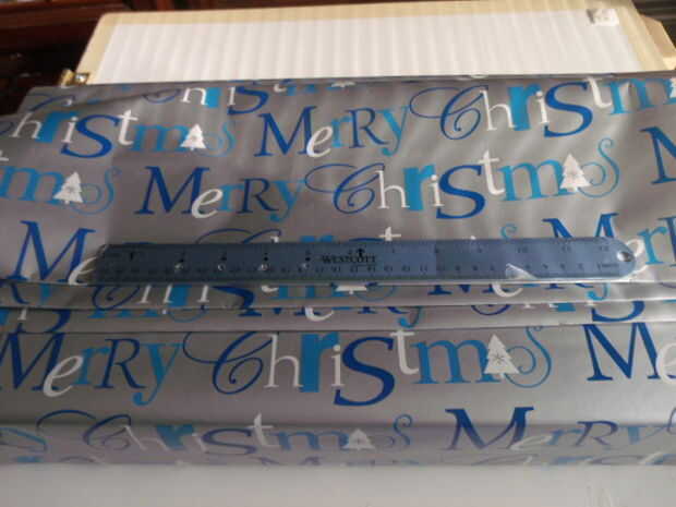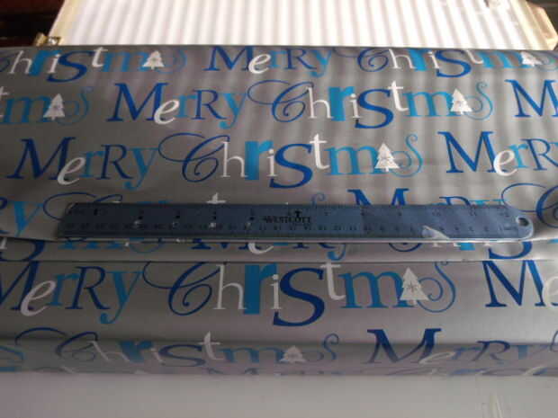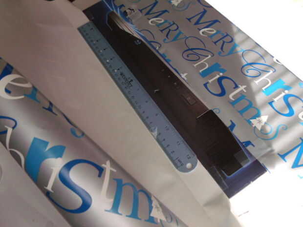 Ahora coloque la regla en el borde del envoltura de papel y dobla el papel sobre la regla, la regla sirve como un borde recto. Este paso se repetirá en el lado opuesto. Repetir 3 - 4 veces para aumentar la cantidad de pliegues deseados sin quedarse sin papel de regalo. Consulte las fotos para un visual.