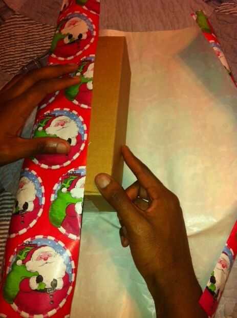 Doblar el lado izquierdo y derecho del regalo del papel de embalaje, por lo que se encuentran en el centro de la actualidad.