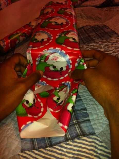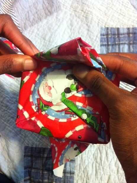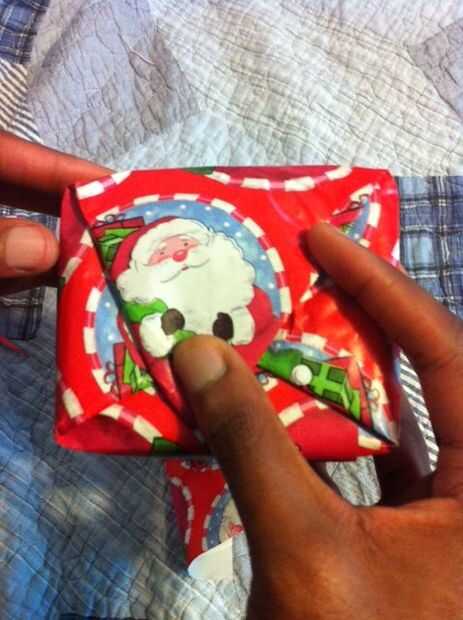 Tome los lados superior e inferior, que ahora son espacios abiertos y presione hacia abajo el borde superior del regalo del papel de embalaje. Después de hacerlo, dobla las dos esquinas que sobresalen y doblarlas para que queden diagonales. Ahora Levante la pestaña inferior y cinta todo abajo. (Usted puede también cinta abajo al lado si quieres).