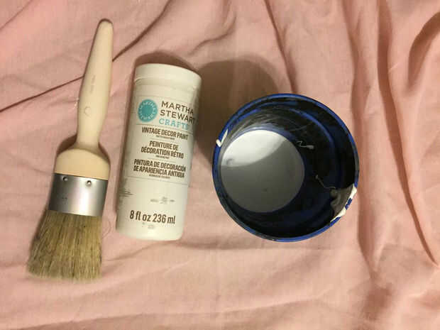 1. pintura--he utilizado pintura de Martha Stewart Vintage Decor (dos botellas de ocho onzas en pastel de bodas), pero no cualquier pintura de tiza para este proyecto. Annie Sloan es el original, pero también puede usar pintura de revestimiento calcáreo decoración Americana o mezclar tu propia. (Marca de MS es $8 para un 8 oz botella, pero normalmente puede usar un cupón)