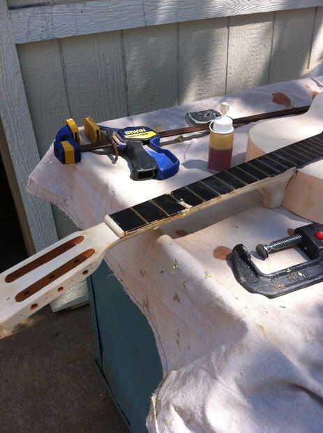 Construcción total (no incluye tiempo de secado del pegamento) tomó cerca de 3 horas para esta guitarra. Hice mi mejor esfuerzo para usar el más barato posible de piezas. Las únicas herramientas que utilizo para tallar el cuello son un cuchillo, Sier
