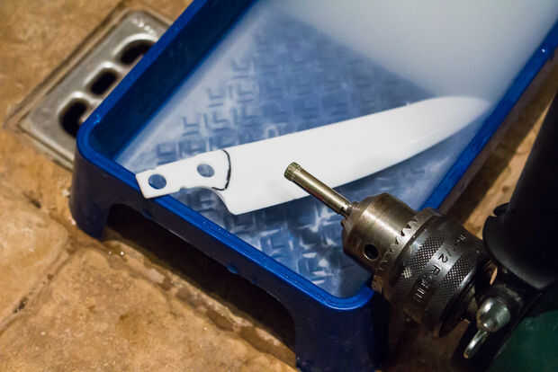 Como con cualquier cosa hecha con herramientas de diamante - mantenerlo húmedo. Como se ve en la foto utilicé un recipiente de plástico diseñado para pintar con rodillo y lleno de agua para que la hoja sumergido un poco. Esto dio la broca lo suficiente enfriamiento acción para no recalentarse y derretir o subrayar algo.