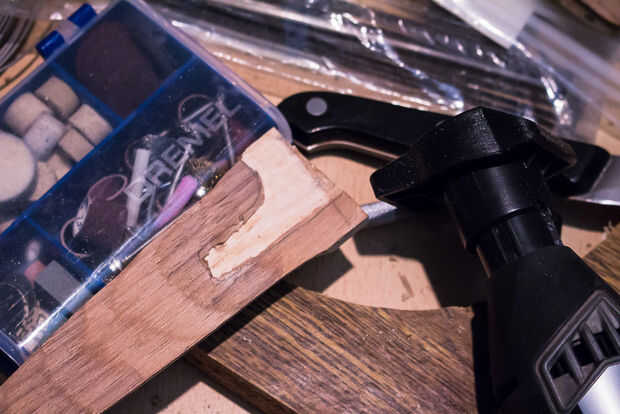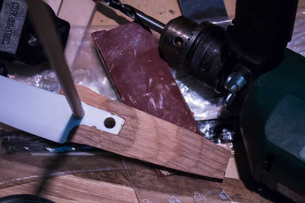 Por ahora es realmente lista para tener la hoja pegada en la hoja, pero no es una mala idea darle algún tipo de forma que desde ahora es lijar un poco más fácil. Usé una amoladora angular con una almohadilla de lijado (que puede cortar los dedos, por cierto), entonces una lijadora excéntrica con grano 120 y todo después de que era grasa de codo hasta grano 500 en la parte frontal de la manija para evitar los puntos difíciles cuando la hoja está en allí.