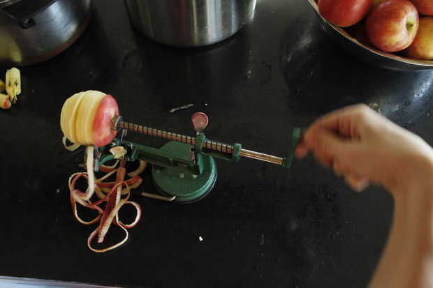 De base y todos ustedes pelar manzanas poner la manzana en las dos ollas grandes y las pieles en el tarrito.