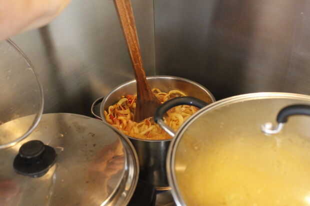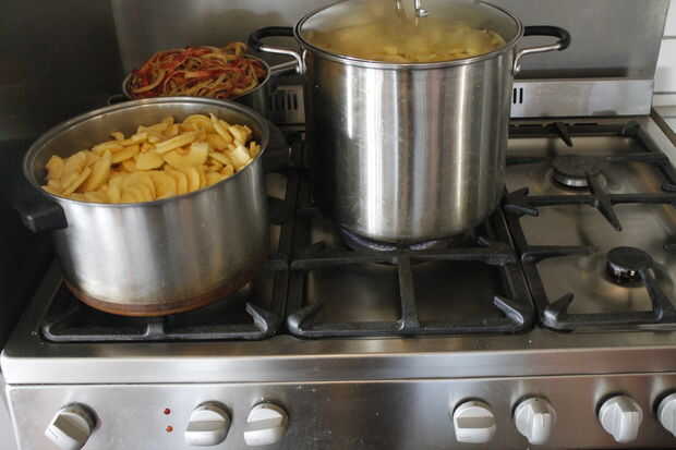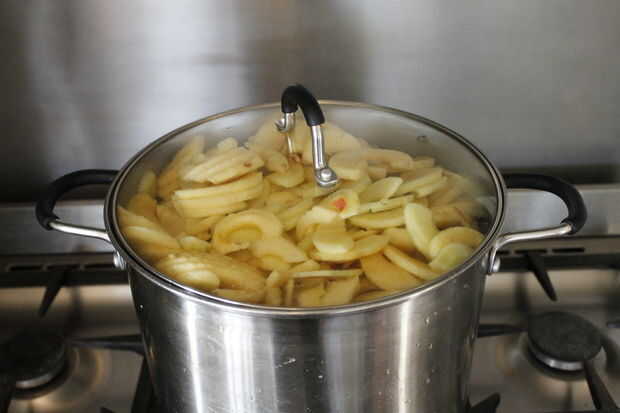 Ponerlos en la estufa con la tapa medio en y llevar a ebullición. Una vez que están hirviendo dejarlos hervir durante unos 2-3 minutos luego bajar las pieles de manzana en el agua, vuelva a colocar las tapas y apaga el fuego y deja enfriar abajo.