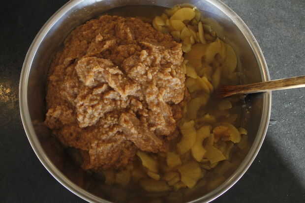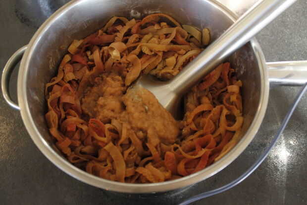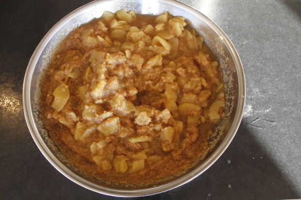 Una vez que tu piel se hayan enfriado, los puré hasta que quede suave. Añadir sus pieles a la mitad las manzanas (como lo hemos hecho) o a todas las manzanas y mezclar junto. Ahora si usted quiere puede puré de la manzana o a puré con una trituradora de la patata hasta que estén tan suave o tan abultada como. Nosotros hemos dejado bastante grueso.