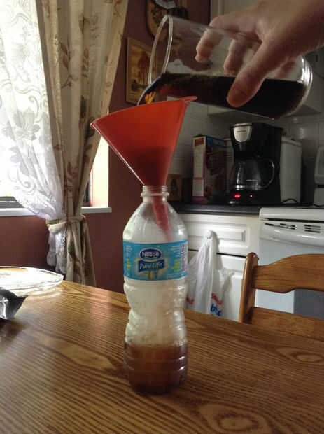Llenar el vaso sobre a medio camino con su copa y vierta la bebida a través del embudo y en la botella.