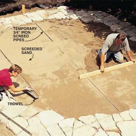 Después de haber agregado arena en las áreas problemáticas, tomar sus dos tubos de 3/4" y colocarlos en la arena para que tengan un pequeño ángulo hacia abajo hacia el borde para el drenaje. Desde aquí, tomar su 2 "x 4" y empezar a nivelar hacia fuera de la arena, mientras que usando los tubos de 3/4" como guías y agregar más arena según se requiera. También utilice la llana para nivelar los rincones y recovecos que no eras capaz de conseguir con el 2 "x 4".