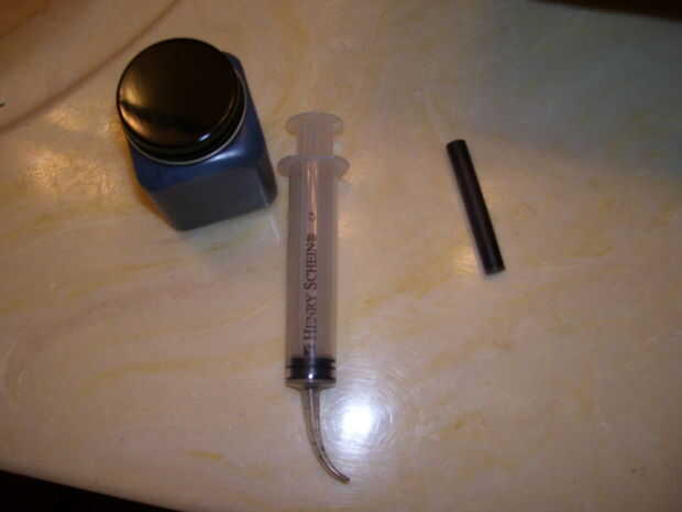* una jeringuilla de líquido (consegui esto de mi dentista después de una cirugía de boca, pero te sugiero tratar de su farmacia local; Asegúrese de que no que utilizas para poner las cosas en la boca o en boca de otras personas ! Una vez que hay tinta allí probablemente no vas a querer meter en la boca)