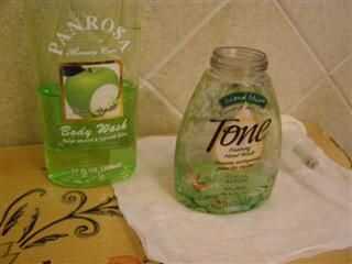 fui con lo que teníamos alrededor - lavado de cuerpo de apple. Es difícil de hacer en el cuadro, por el color - pero me he llenado el recipiente de la bomba de jabón aproximadamente 1/5, luego llenar hasta aproximadamente una pulgada desde la parte superior con agua (para evitar desbordamiento cuando se inserta la bomba)