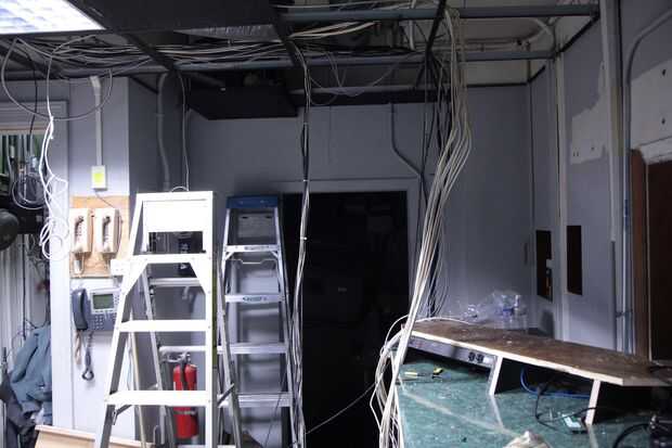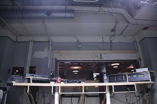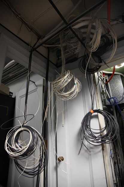así que comencé a tirar millas de cable de micrófono viejo y llegó a la señal real cabeling que conecta el resto del edificio para el soundbooth. los cables verificados deben marcarse entonces hasta los cables de la bobina y empujan hacia la pared...