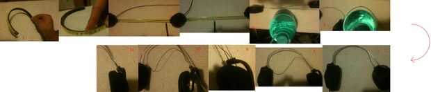 Deslice los dos hilos abiertos a través de los orificios de la carcasa auricular banda.