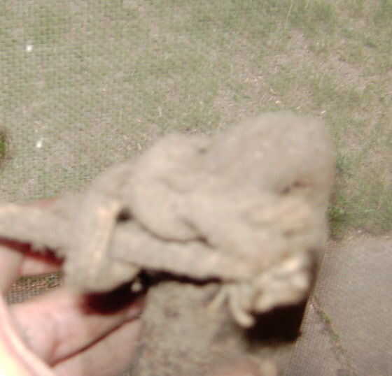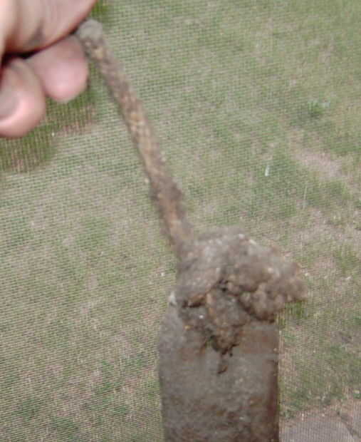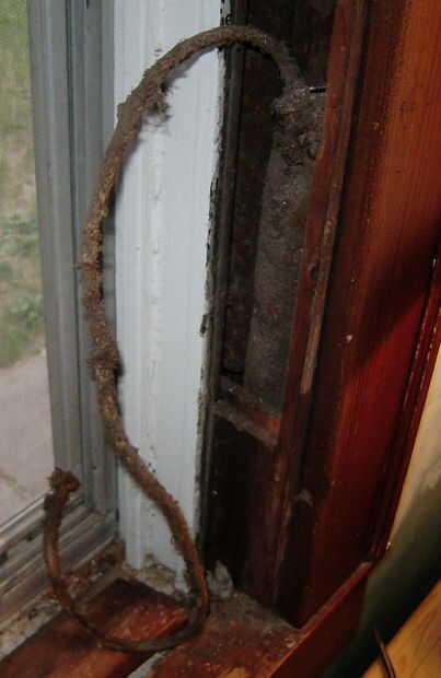 Llegar ahí y coge el peso y tirar de ella. Utilizar guantes si te gusta - nuestros pesos son de hierro, pero como a menudo, pueden ser plomo. Mira la configuración del nudo, si se puede. Usted probablemente no puede, si se ve algo como el peso del ejemplo. Llegamos a la técnica de anudado no-tan-arcano-después de todo después de que consigamos el cable nuevo a través de la polea y por donde podemos llegar.