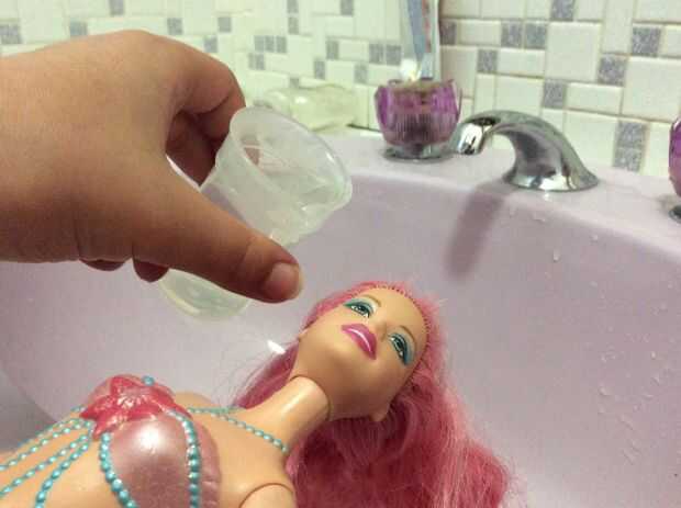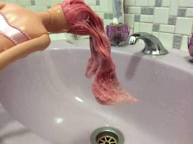 Primero pone su barbie, cabeza colgante junto al fregadero, luego llene el vaso se agua que está cerca de 100 grados (de ebullición). Luego verter sobre el pelo de la barbie teniendo cuidado de no quemarse (confía en mí no quiere conseguir una quemadura). Luego frotar algunos shampoo (se debe tener aspecto espumoso). Luego enjuague el champú con agua (caliente o fría está bien).