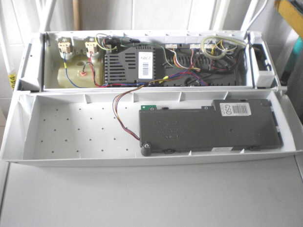 Quite los 2 tornillos en la parte posterior del Panel de Control (ver foto) y levante el Panel de la máquina de la parte de atrás rotando hacia la parte delantera (ver foto). Podrás ver el módulo de Control (una caja de plástico azulada largo con muchos cables y enchufes) fijados a la máquina. El Panel de Control está conectado al módulo de Control por un cable con un enchufe. Desconectar el módulo y dejar a un lado el Panel de Control en un lugar seguro.