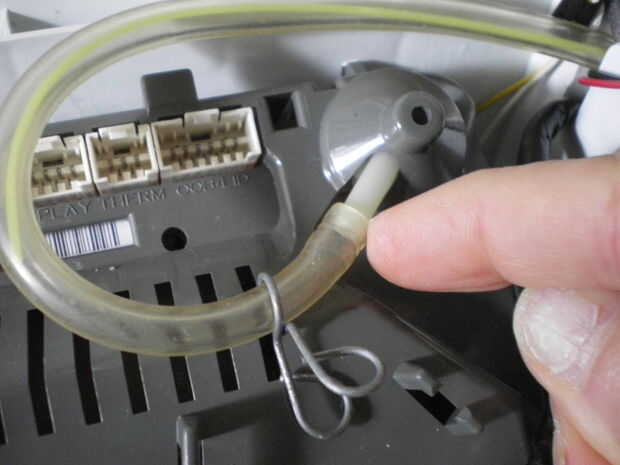 En primer lugar, con mucho cuidado retire la manguera del sensor de presión el Sensor de presión quitando el clip de resorte hacia la manguera y empujar el borde de la manguera del sensor (ver foto). No tire de la manguera ya que agarra el tubo plástico del sensor y posiblemente se romperán! Tenga cuidado, ya que la manguera más probablemente ser pegada al sensor por años de contacto.