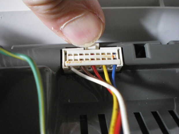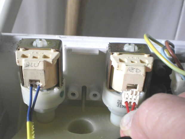 Después de quitar todos los tapones desde el módulo de Control, hay todavía dos cables de izquierda va a la caliente y válvulas de agua fría y ambos tienen conectores hacia abajo (ver foto). Con cuidado desconectar los 2 conectores pero poner marcas sobre ellos (como RED y BLU) para volver a colocar correctamente porque estos dos son de tamaño similar.