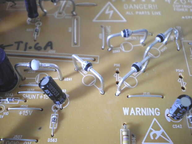 Con el multímetro todavía fijado a la gama de comprobación de diodo, compruebe cada uno de los diodos de potencia grande en el otro lado del tablero (ver foto) la siguiente manera: Conecte las puntas DMM en cada extremo del diodo y una indicación de circuito abierto (sin indicación) o una indicación de diodo (una indicación de un lugar entre 0.4 y 0.6). Luego invertir las puntas de prueba y Compruebe la indicación contraria a la que antes. Si cualquiera de las lecturas del DMM indica un corto o un abierto en ambos sentidos, el diodo está defectuoso; y debe ser reemplazado. Revise todos los diodos de potencia. Nunca encontré ninguno de los diodos más pequeños fallos, pero si todo lo demás falla reparar la Junta, tendrá que comprobar estas demasiado. En la última reparación, todos los cuatro diodos en la configuración de puente las tapas de electro de alimentación habían soplado todo agrietado abierto y parte de la pista del PCB había vaporizado.