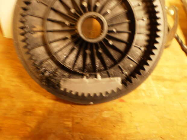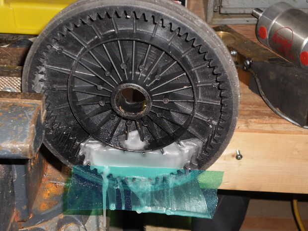Una vez que todas las rebabas del plástico fundidas sacar spray con un agente desmoldante (yo usé para cocinar). Aplique la cinta a través de una buena sección de la rueda. Derretir algunos cera del parafin y scoop en área de preparado. Dejar enfriar y aclimate para unos hours.once su ajuste endurecido el exceso y cuadrados para arriba. Para poner la rueda en el congelador durante una hora o dos; Esto ayuda a liberar la cera. Para obtener cera bang rueda contra el contador o la mano y la cera se deslice hacia afuera. Asegúrese de que crear este molde de cera con dientes sin daños.
