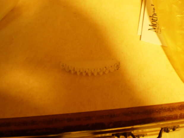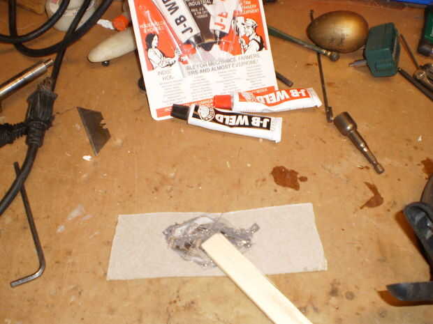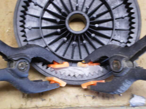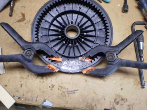 Rueda de lavado con detergente para remover cualquier grasa o aceite. Deslice el molde de cera sobre la zona dañada y la abrazadera en su lugar. He utilizado JB Weld.. .mix el epoxy y la fuerza en los puntos que faltan dientes. Permite endurecer 24 horas (si usa JB Weld como hice yo)