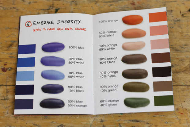 Con cada multipack de sugru viene un mega útil pequeño folleto llamado '7 pasos para convertirse en un gurú de sugru' y se llena con un montón de consejos de sugru impresionante. Si vaya al paso 6 hay una guía para ayudar a mezclar los colores de sugru.