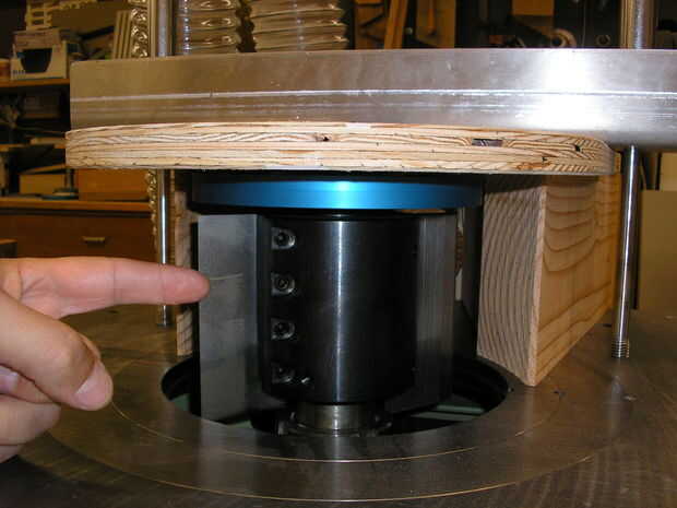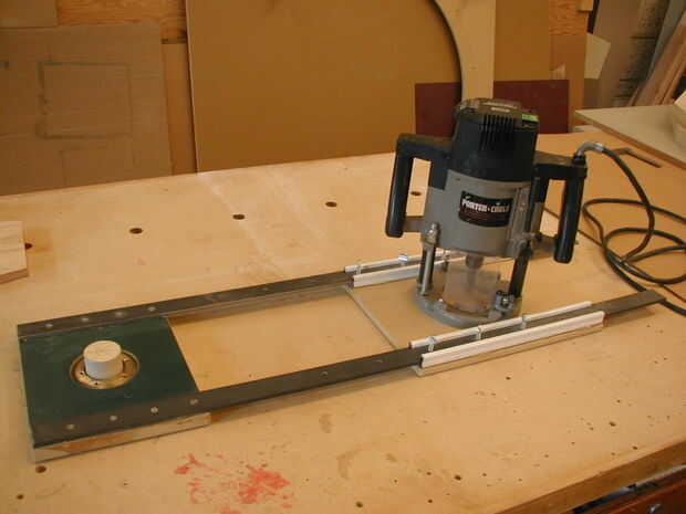 La primera foto es de la plantilla de router que hice para hacer los patrones perfectos. Usé algunos canal acero, MDF y un muy bonito pedazo redondo de latón para el pivote.