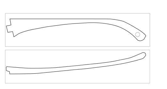 Me dibujó en un pedazo de papel el contorno de la pieza rota y lo analizan. Utilizando Inkscape completé un poco vectorial. He intentado hacer apuesto con la pieza frontal de lentes. Debido a utiliza el pedazo roto original para dibujar la parte de la bisagra, era más fácil obtener el ángulo bueno entre la bisagra y el brazo.