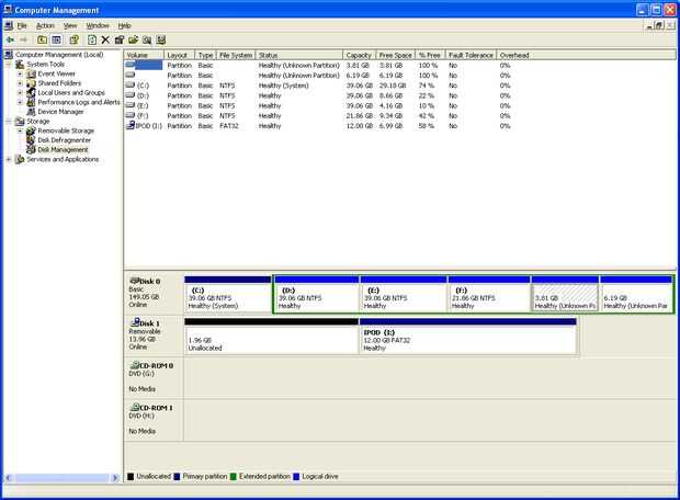 Ahora tengo el Ipod conectado como disco 1 y se verá un espacio sin asignar unos 39MB frente a iPod (nota que en el cuadro que tengo aquí es un espacio sin asignar de cuantos gigabytes, una vez finalizado el proceso)