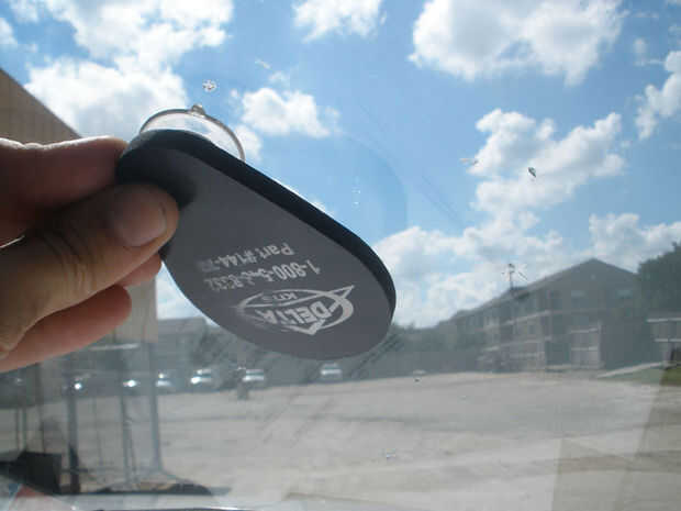 A continuación, enlazar su espejo en el interior del parabrisas, centrado en el chip que va a ser reparar. Esto le permitirá mantener un ojo en el chip desde todos los ángulos, que es muy útil con todas las reparaciones de parabrisas.