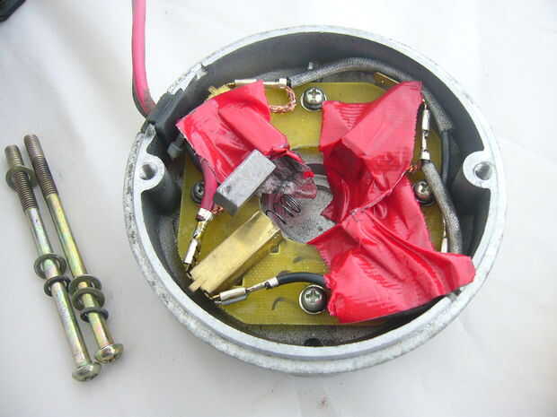 Cualquier caso desatornillar y apartar - entonces jale la tapa trasera de la carcasa del motor. Si tus pinceles son resorte (como este motor), puede surgir apartes. Quite la tapa lentamente para evitar que cualquier resortes pícaro desaparecer bajo su banco de trabajo.