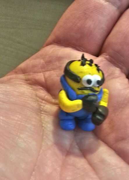Sentado en la cuneta sintiendo deprimido y sed un pedazo de cadena, dice "¡ oye! Tengo una idea!"y empieza girando y girando, tirando de él mismo en un nudo, luego pone unas gafas de sol pequeñas como un disfraz.
