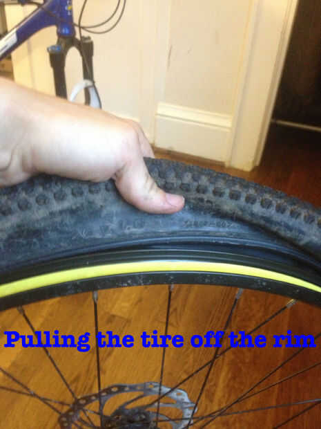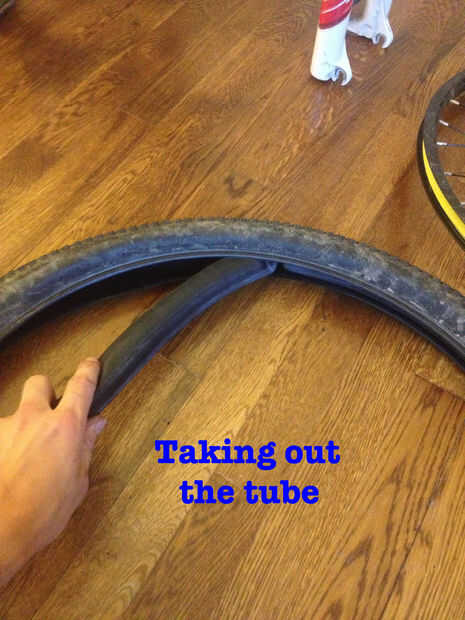 2. Tire neumático de la llanta. Aquí es donde una palanca de neumático será muy útil si usted tiene uno. De lo contrario, sólo use sus manos para empezar a tirar el neumático de la llanta mientras que cuidadosamente extrae la válvula también (foto arriba).