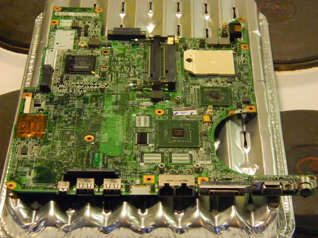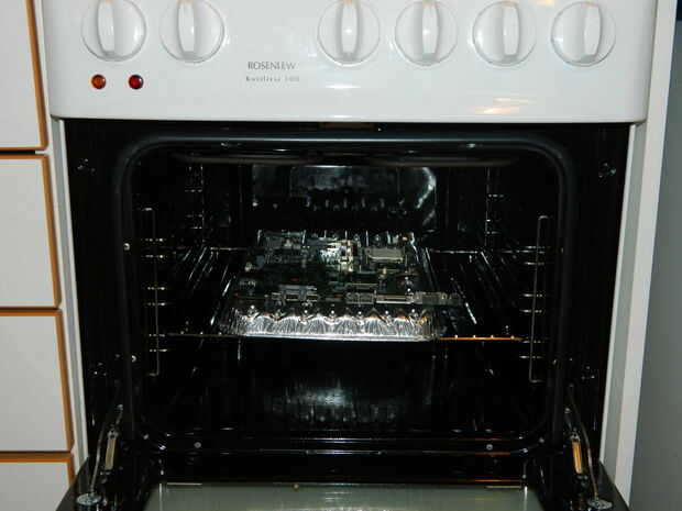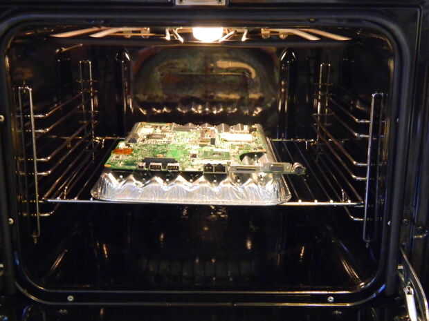 Deje que el horno haga su magia y después por unos 10 minutos apagar el horno y abrir la escotilla y déjela enfriar 30 minutos antes de tocar la placa base buena. Esto es porque la soldadura necesita tiempo para enfriar correctamente y colocar a su propio lugar. Si la placa base se mueve mientras está todavía caliente frenará y la solución no funcionará.