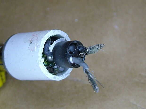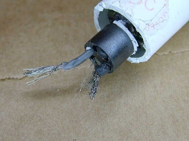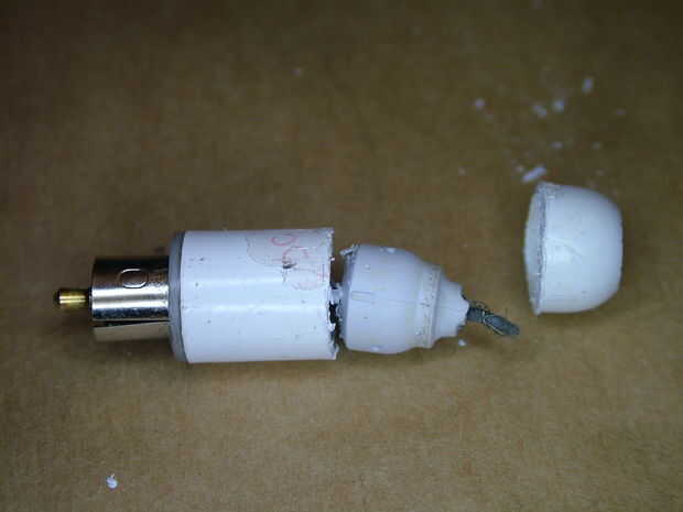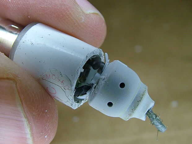 Deslice el extremo pequeño del tubo plástico de la goma "enchufe" debajo.  Ahora cuidadosamente cortado a través del tapón de goma o manguito con un pequeño cuchillo o tijeras y deséchelo.  La carcasa de metal por debajo parece ser un retenedor de cable diseñado originalmente para prevenir jalando los cables de la placa de circuito en el enchufe.  Debe tener al menos 1/8 a 1/4 de pulgada de cable utilizable para soldar esta parte posteriora del conjunto.  Si no luego tendrás que quitar los cables viejos y nuevos coletas a la placa para continuar la soldadura.  Yo he reparado dos de ellas con éxito sin tener que quitar los cables viejos de la placa de circuito.
