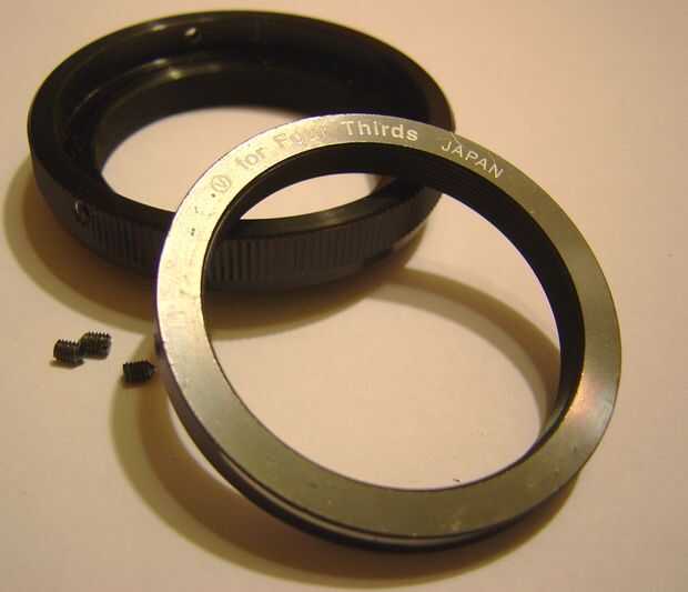 Un anillo de T es el mejor tipo de adaptador para este trabajo. Ofrece dos posibilidades de montar un objetivo, mediante el roscado de 42M del anillo interno o retirando el anillo y colocación del tubo en el conector principal directamente. La que se muestra aquí es la Olympus cuatro tercios t-anillo para réflex digitales que tiene un tipo de bayonette de montaje.