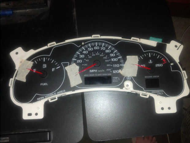 Ahora gire cada aguja en sentido horario hasta que alinee con la marca. Si accidentalmente vas demasiado lejos simplemente mantener rotación contra las agujas del reloj hasta que regreses a su marca (Recuerde es Muy importante que usted línea los agujas hasta el exacto líneas que te marcada en cinta o bien su unidad será leer incorrectamente) a continuación, retire las piezas de la cinta y poner el resorte en su lugar seguido por el reset de kilometraje / botón de disparo , ahora, vuelva a instalar la lente claro.