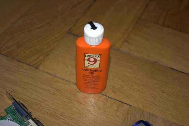 he utilizado lubricante de pistola #9 algunos Hoppe en mi ventilador. Trabajó muy bien. Añadir unas gotas de lubricante al interior borde del ventilador. Girarlo alrededor hasta parece húmeda. Trate de no usar más lubricante que sea necesario. Ayuda a volver a poner el ventilador en el rodamiento y gira alrededor de un pedacito para conseguir una capa uniforme agradable.