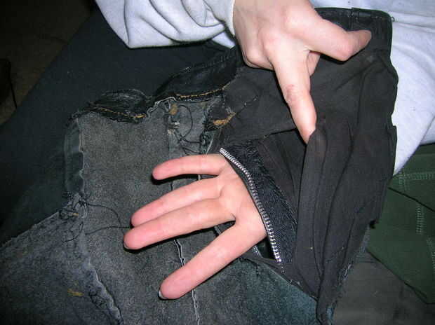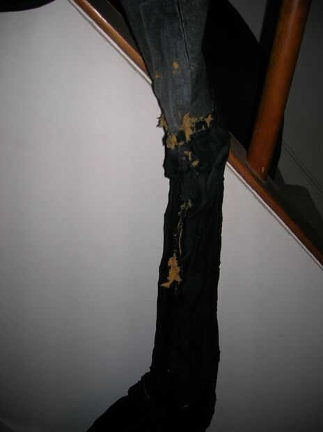 Debido a la edad de la chaqueta, se puede ver donde había aislamiento podrido aunque tiempo. (Todo eso naranja polvo como cosas). Tuve que vacío y elimine la mayor parte de él. Sin olvidar, la suciedad y años de recibos que quedó atrapados dentro de la chaqueta con el tiempo debido a los agujeros.