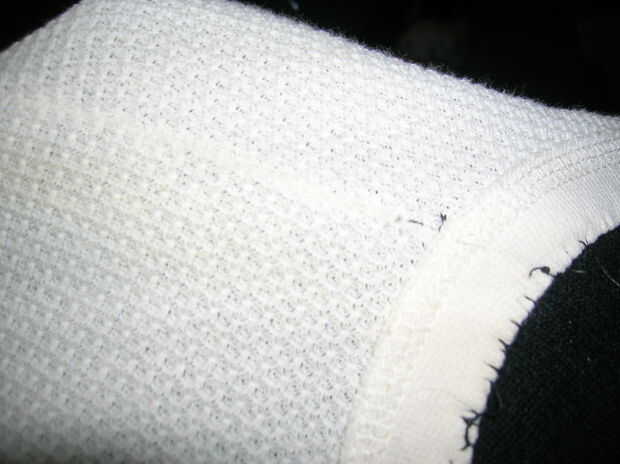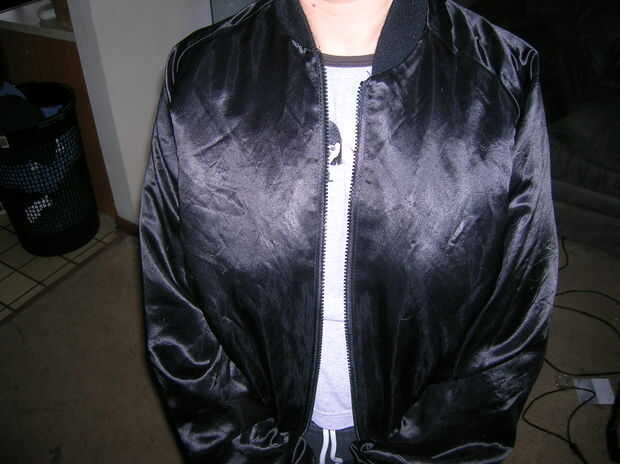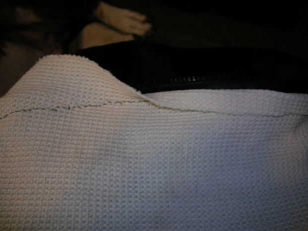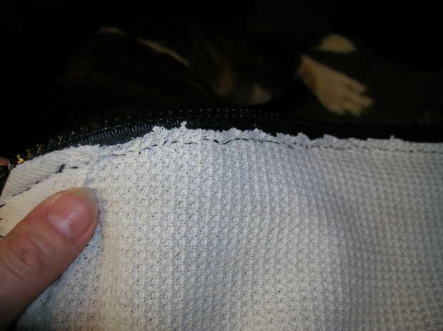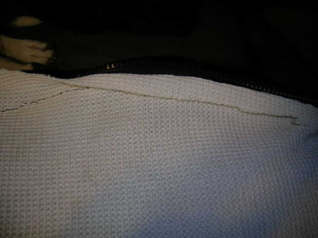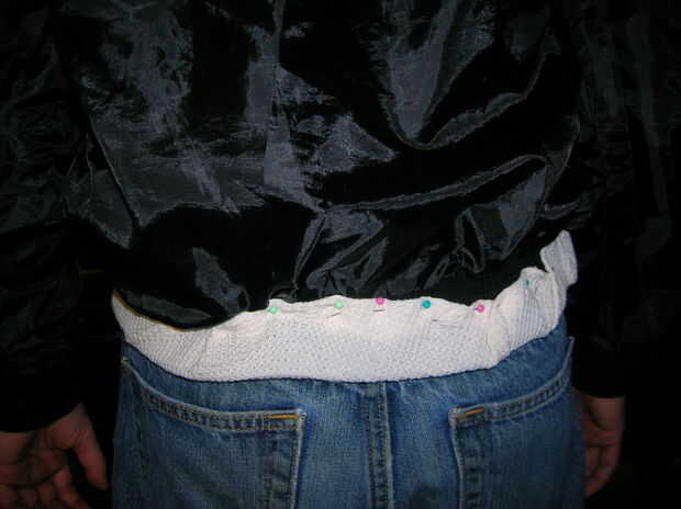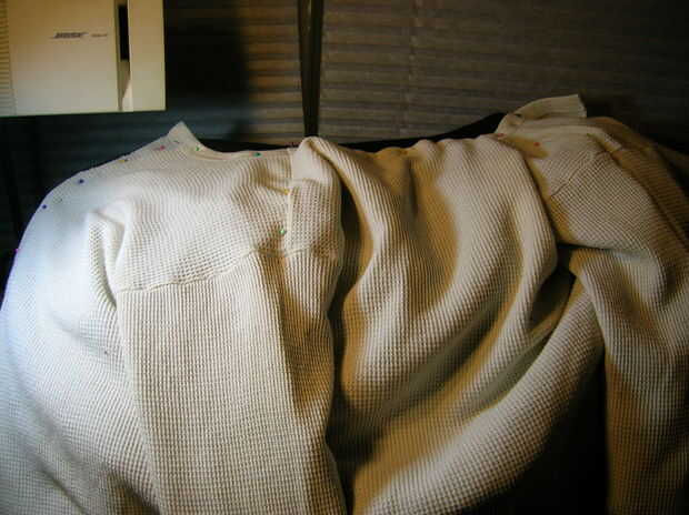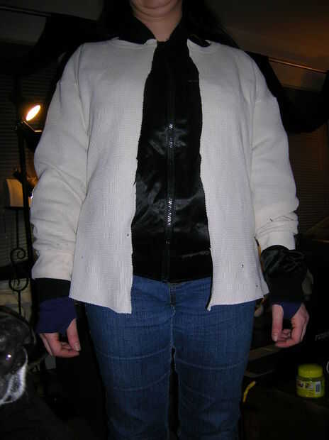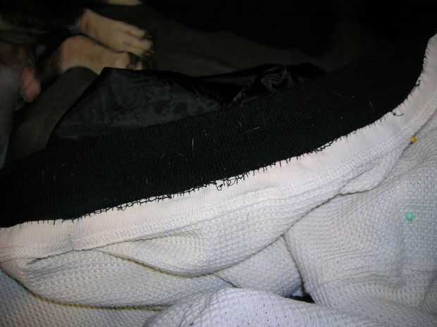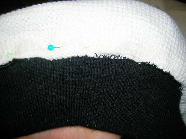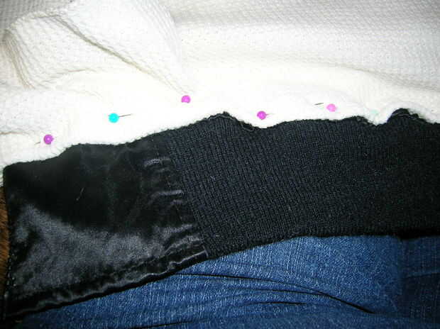 El siguiente paso fue para deslizarla sobre la parte exterior de la chaqueta de raso y pasador costuras, cuello y puños para mantenerlo en su lugar. Esta parte fue un poco difícil y necesitaba a una segunda persona. Por suerte, mi niño de 12 años que es casi del mismo tamaño que yo, me deja utilizarlo como un maniquí. Es mejor para el inicio y la parte superior y trabaje su manera abajo. De esta manera térmica extra sería todo en la parte inferior y se puede quitar fácilmente.