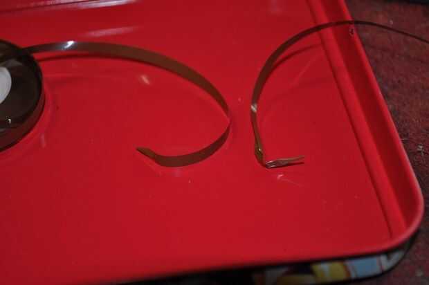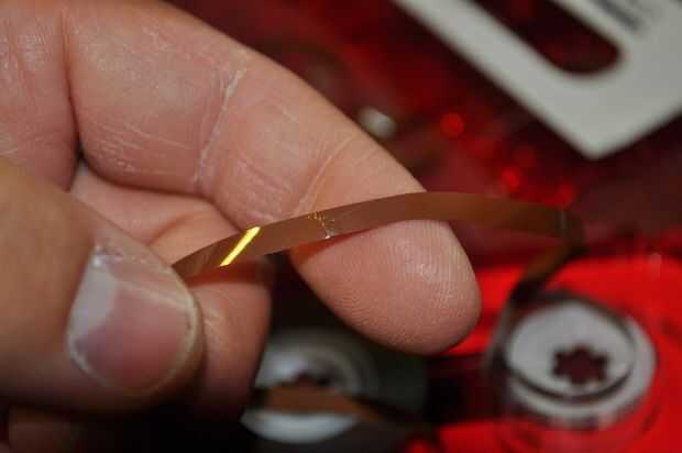 Utilice un trozo de invisible recortada de la cinta scotch para mantener unida a empalme. ver foto 3. cinta Scotch no debe sobresalir en cualquier lugar en la cinta magnética. cualquier proyección significará que hay cinta adhesiva esperando para coger en el mecanismo y vendar las cosas. ver foto 4 y 5.